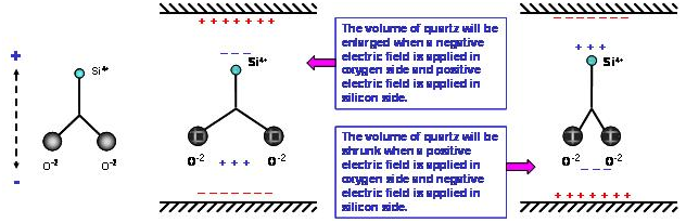 石英材料中的二氧化硅分子(SiO2) 在正常狀態下, 其電偶極是互相平衡的電中性. 在(圖二左)的二氧化硅是以二維空間的簡化圖形. 當我們在硅原子上方及氧原子下方分別給予正電場及負電場時, 空間系統為了維持電位平衡, 兩個氧原子會相互排斥, 在氧原子下方形成一個感應正電場區域, 同時在硅原子上方產生感應負電場區域. 相反的情況, 當我們在硅原子上方及氧原子下方分別給予負電場及正電場時, 兩個氧原子會相互靠近, "7W-25.000MBA-T"氧原子下方產生感應負電場,硅原子上方產生感應正電場. (圖二). 然而, 氧原子的水平位置變化時, 鄰近的另一個氧原子會相對的產生排斥或吸引的力量, 迫使氧原子回到原來的空間位置. 因此, 電場的力量與原子之間的力量會相互牽動, 電場的改變與水平方向的形變是形成交互作用狀.