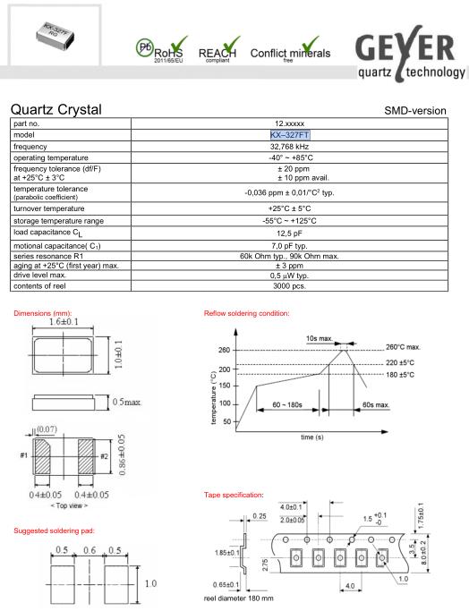 Geyer晶振,KX-327FT晶振,超小型晶振,32.768K時鐘晶體具有小型,薄型,輕型的貼片晶振表面音叉型晶體振蕩器,產品具有優良的耐熱性,耐環境特性,可發揮晶振優良的電氣特性,符合RoHS規定,滿足無鉛焊接的高溫回流溫度曲線要求,金屬外殼的封裝使得產品在封裝時能發揮比陶瓷振蕩器外殼更好的耐沖擊性.