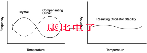 使用標準補償技術(shù),可以在-40℃至+85℃的溫度范圍內(nèi)實現(xiàn)約±1ppm的分數(shù)穩(wěn)定性.在較窄的溫度范圍內(nèi)可以實現(xiàn)更好的穩(wěn)定性.除了最簡單的TCXO晶振之外,所有技術(shù)都采用的實際技術(shù)是基于與晶振串聯(lián)使用的變?nèi)荻O管,如下所示: 電壓的變化引起變?nèi)荻O管的電容變化,導致振蕩頻率的變化.熱敏電阻網(wǎng)絡適用于晶體,使電壓隨溫度變化,從而補償晶體的頻率與溫度特性.由于每個TCXO要求其補償網(wǎng)絡與其單個晶體匹配,因此TCXO的成本與頻率與溫度規(guī)格的難度密切相關.