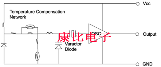 溫度穩(wěn)定性使用標準補償技術(shù),可以在-40℃至+85℃的溫度范圍內(nèi)實現(xiàn)約±1ppm的分數(shù)穩(wěn)定性.在較窄的溫度范圍內(nèi)可以實現(xiàn)更好的穩(wěn)定性.除了最簡單的TCXO晶振之外,所有技術(shù)都采用的實際技術(shù)是基于與晶振串聯(lián)使用的變?nèi)荻O管,如下所示: 電壓的變化引起變?nèi)荻O管的電容變化,導致振蕩頻率的變化.熱敏電阻網(wǎng)絡適用于晶體,使電壓隨溫度變化,從而補償晶體的頻率與溫度特性.由于每個TCXO要求其補償網(wǎng)絡與其單個晶體匹配,因此TCXO的成本與頻率與溫度規(guī)格的難度密切相關.