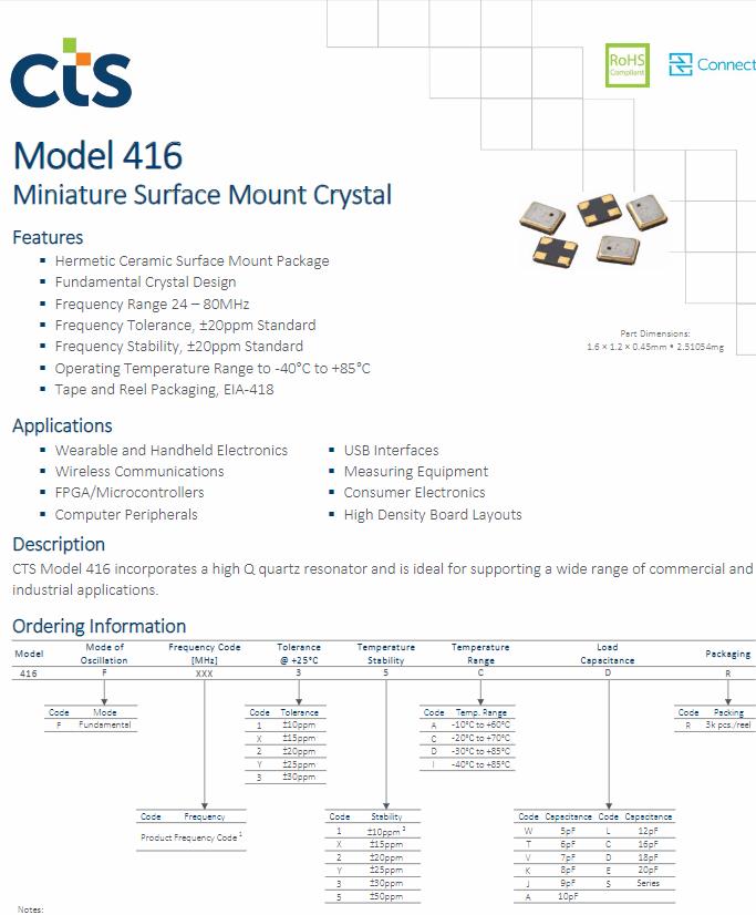 | 416F40613CTR | CTS晶振 | 416 | MHz Crystal | 40.61MHz |