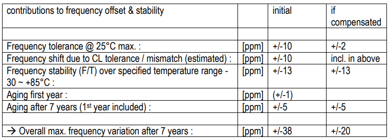 請在下表中找到有助于理解ppm總預算中哪些捐款可選地通過單獨的頻率補償來補償,哪些貢獻隨溫度而變化(即空燃比)或在以下時間無法預測制造(即老化).