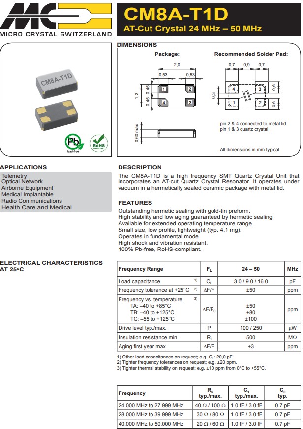 瑞士微晶在瑞士、泰國建有石英晶振,晶體振蕩器生產中心,及遍布世界各地的代表處。我們所有的產品都得到ISO9001和ISO14001的認證,并達到RoHS,REACh等規范的要求。全球約550個員工的責任感和奉獻精神是我們成功的基石。我們對管理、環境、社會責任都有明確的行為準則(比如對有爭議的原材料的問題上),這些是我們在未來保持競爭優勢的主要原因。CM8A-T1D是一個高頻SMT石英晶體單元,CM8A-T1D24.000MHz9.0pF±50ppmTAQI