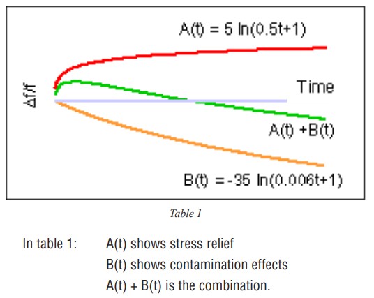 當施加應力時,石英晶體會改變頻率。這種壓力可以來自于任何一種或所有的幾種來源。封裝和安裝,環(huán)氧樹脂連接,金屬薄膜,和石英本身可以是應力的來源。如果應力在該部件的使用壽命中是恒定的,則頻率將保持不變。然而,在現(xiàn)實世界中,壓力會隨著時間的推移而放松,因此,壓力相關的就會老化。