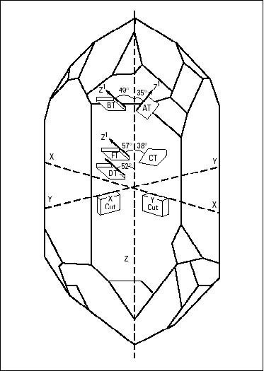 晶片的切割可分為AT-CUT, BT-CUT, CT-CUT, DT-CUT, FT-CUT, XT-CUT, YT-CUT,如圖所示.它是以光軸(Z軸)為參考而命名,每種切法對應(yīng)一個角度.采用何種切法應(yīng)根據(jù)實際情況而定,如對溫度特性要求較好則應(yīng)采用AT-CUT,如果對晶振要求的頻率較高時則采用BT-CUT.晶片的切割方式、幾何形狀、尺寸等決定了晶振的頻率.
