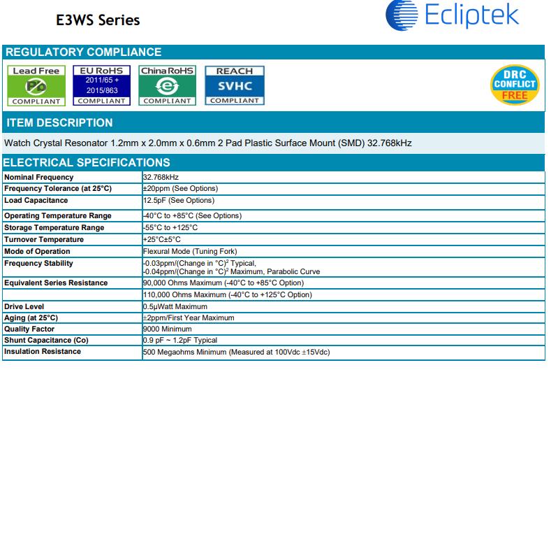 | E3WSDC12-32.768K TR | Ecliptek晶振 | CRYSTAL 32.7680KHZ 12PF SMD | -40°C ~ 85°C |