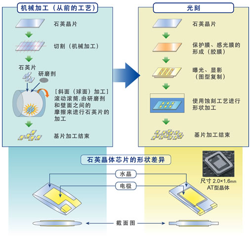 這種蝕刻工藝幫助愛普生EPSON解決了很多難題,尤其是小體積貼片晶振的不斷發展,像2520、2016、2012等小體積晶振都是通過這種方法解決小體積難打磨的問題.因為本身體積就比較小,外殼封裝里面的芯片更是要打磨的很小才能封裝的下去,如果利用機械加工打磨本身晶元就比較大很難打磨,使用光刻加工技術,就可以使石英晶體芯片的形狀保持均一.與機械加工(左)相比,即使是超小型石英晶體,也可以實現不均度少的優越的溫度特性,所以在穩定方面和耐溫度環境方面都要比機械加工的晶體質量穩定度要高出很多.