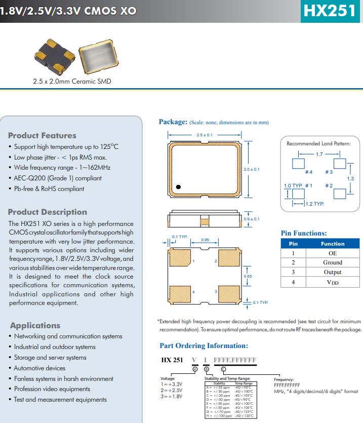 HX251 XO時鐘振蕩器系列是高性能的CMOS晶體振蕩器家族,支持高具有極低抖動性能的溫度。它支持各種選項,包括更廣泛頻率范圍,1.8V/2.5V/3.3V電壓,和在較寬的溫度范圍內具有多種穩定性。它是為滿足時鐘源而設計的通信系統規范,工業應用等較高設備性能。
