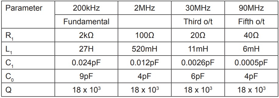 電學(xué)上,石英晶體可以用等效的 圖1的電路,其中串聯(lián)組合了R1、L1和C1 代表壓電材料對阻抗的貢獻 效應(yīng),C0代表電容之間的分流電容 電極以及任何雜散電容。電感 L1是石英質(zhì)量的函數(shù),而電容C1是 與它的硬度有關(guān)。R1的阻力來自于損失 在石英和安裝裝置中。的參數(shù) 等效電路可以測量到1%的精度。 等效電路的電抗-頻率圖如圖所示 2.晶振性能有很多相關(guān)的公式;第一 這些是給fs的。這是晶體串聯(lián)的頻率 諧振,由下式給出: 其中,fs的單位是赫茲,L1的單位是亨利,C1的單位是法拉。 典型晶體參數(shù)值: