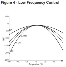 圖4顯示了幾個低頻截點的頻率溫度曲線。J切割在10kHz以下使用,而XY切割可以 從3千赫到85千赫使用。NT-cut可用于10kHz 范圍。DT-cut適用于100kHz至約800kHz,CTcut適用于300kHz至900kHz。