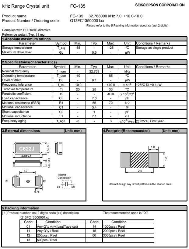 | Q13FC1350003900 | 3.2 x 1.5 x 0.9 mm | FC-135 | 32.768kHz | 7.5 pF | +/-10.0 ppm | -40 to +85 °C |