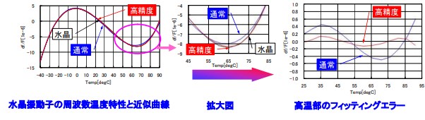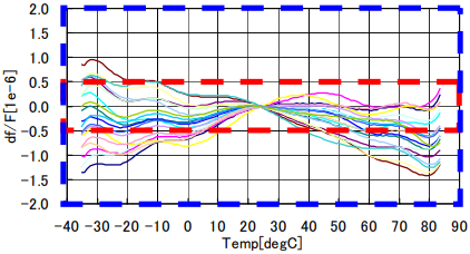 如圖3所示,參考用的溫補晶振的頻率溫度特性在通常的修正中滿足±2.0ppm(規格:外側的點線),但在通常的修正中無法實現±0.5ppm(規格:內側的點線).因此有必要進行高精度的溫度補正.圖4示出了頻率-溫度特性的高精度修正的例子.通過該高精度修正,如圖5所示,可滿足±0.5ppm.如圖4,5所示,通過根據水晶振子的頻率溫度特性進行高精度修正,可減小擬合錯誤,實現滿足GPS用途所要求的振蕩頻率容許偏差±0.5ppm的溫補晶振.為了實現這個高精度,人工水晶,水晶振子,電子電路的所有領域都有必要解決技術課題.