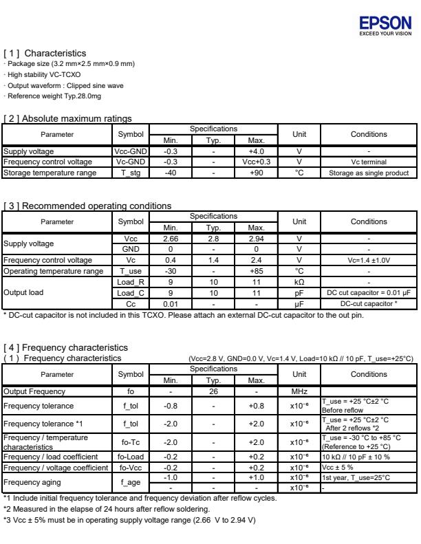 | X1G004201001000 | TG-5006CE | 26.000000 MHz | 3.20 x 2.50 x 0.90 mm | 2.850 to 3.150 V | +/-2.0 ppm | -30 to +85 °C | +/-0.50 ppm |