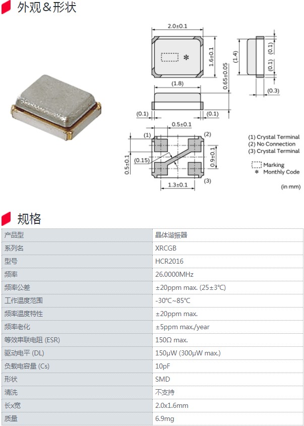 | XRCGB26M000F1H02R0 | HCR2016 | 26.0000MHz | ±10ppm max. (25±3℃) | 消費級 |