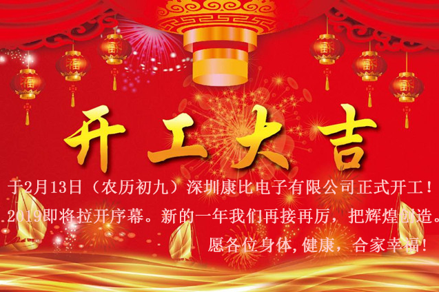 深圳康比電子有限公司于2月13日(農歷初九)正式開工啦!在過去的一年我們風雨同舟,換來業績攀高;你的努力猶如驚嘆號,艱辛異常;你的收獲好比句號,圓圓滿滿;你的成功就像省略號,綿延不斷;2019即將拉開序幕,新的一年我們要再接再厲,大展身手,為事業的道路上留下輝煌的手筆!拼搏與努力,奠定了卓越的業績;把輝煌創造.