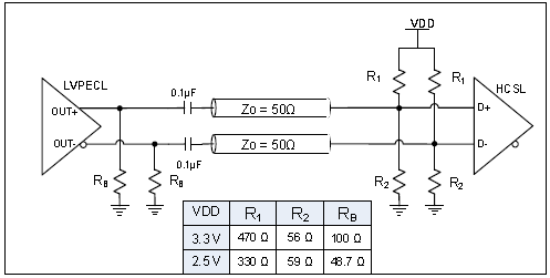 典型的HCSL接口使用電流模式驅(qū)動(dòng)器,在源端使用50Ω至GND端接,在接收器端不使用端接.此外,對(duì)于HCSL輸出驅(qū)動(dòng)器,LVPECL差分晶振驅(qū)動(dòng)器可用于驅(qū)動(dòng)HCSL輸入.圖3顯示了驅(qū)動(dòng)帶LVPECL輸出的HCSL接收機(jī)的推薦端接原理圖.為了滿足HCSL接收機(jī)要求的750毫伏的VOH電平和0V的VOL電平,它采用交流耦合電容來(lái)分離源和負(fù)載偏置電壓.