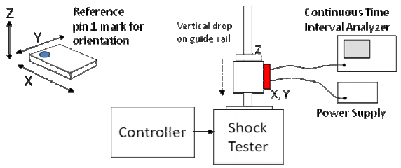 沖擊測試設置如圖4和5所示.與振動測試方法相似,我們將振蕩器定向為在x,y和z方向施加沖擊,并測量最壞的情況.連續10秒每100秒進行一次頻率測量,提供沖擊前,沖擊中和沖擊后的頻率響應數據.