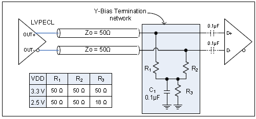大多數情況下,戴維寧等效端接工作良好,但如果差分對兩側的走線之間或電阻網絡之間存在明顯不匹配,或者接收器對共模噪聲過于敏感,戴維寧等效端接可能對電源噪聲敏感.圖5顯示了Y偏置端接網絡,它提供了VDD–2V的有效端接電壓,而無需連接到VDD或接入額外的端接電壓源.終端電壓由流經電阻R3的差分晶體振蕩器對電流之和產生.電容器C1用于在終端電壓下產生交流接地.