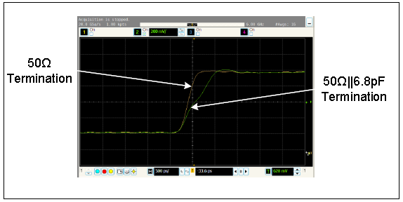 其中rT是20%至80%的上升時間,LC是負載電容.圖7顯示了6.8pF寄生輸入電容如何影響LVPECL波形上升沿的示例.