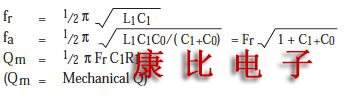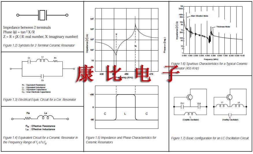 等效電路常數(shù):圖1.2顯示了陶瓷諧振器的符號.端子間的阻抗和相位特性如圖1.5所示.該圖說明諧振器在提供最小阻抗的頻率fr(諧振頻率)和提供最大阻抗的頻率fa(反諧振頻率)之間的頻率范圍內(nèi)變?yōu)殡姼行缘?它在其他頻率范圍內(nèi)變得具有電容性.這意味著雙端諧振器的機(jī)械振動可以用等效電路代替,該等電路由串聯(lián)和并聯(lián)諧振電路的組合構(gòu)成,其中包括電感器L,電容器C和電阻器R.在諧振頻率附近,等效電路可以表示如圖1.4所示.fr和fa頻率由壓電陶瓷材料及其物理參數(shù)決定.等效的循環(huán)常數(shù)可以從以下公式確定: 考慮到fr<f<fa的有限頻率范圍,阻抗給定為Z=Re+jwLe(Le<=0),如圖1.5所示.陶瓷諧振器應(yīng)作為具有損耗Re()的電感器Le(H)操作.圖1.1表示陶瓷諧振器和石英晶體諧振器之間等效電路常數(shù)的比較,注意,電容和Qm存在很大差異,這導(dǎo)致實際操作時振蕩條件的差異.附錄中的表格顯示了每種陶瓷激光器的等效電路常數(shù)的標(biāo)準(zhǔn)值.除了期望的振蕩模式之外,存在用于其他振蕩模式的高次諧波.存在這些其他振蕩模式是因為陶瓷諧振器使用機(jī)械??共振.圖1.6顯示了這些特征.