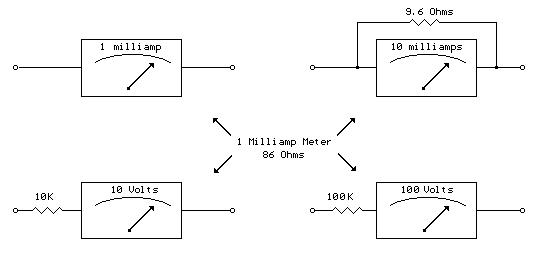 通過增加串聯電阻,毫安表可用作電壓表.所需的電阻是滿量程電壓讀數除以儀表運動的滿量程電流.因此,如果你有一個1毫安表并且你想讀0-10伏,你將需要10/.001=10K歐姆的總電阻.儀表運動本身將具有較小的阻力,這將是總10K阻力的一部分,但通常低到足以忽略.以下示例中的電表具有86歐姆的電阻,因此所需的真實電阻值為10K-86或9914歐姆.但使用10K標準值將在1%以內,因此我們可以忽略86歐姆.對于1伏的滿量程讀數,儀表電阻將更加重要,因為它將占所需總電壓的8%左右,因此您可能需要使用914歐姆電阻,或910標準值.毫安表還可用于通過增加并聯電阻來測量更高的電流.電表電阻現在變得非常顯著,因為要將范圍增加十倍,我們需要通過并聯電阻繞過總電流的9/10.因此,要將1毫安表轉換為10毫安表,我們需要一個86/9=9.56歐姆的并聯電阻.