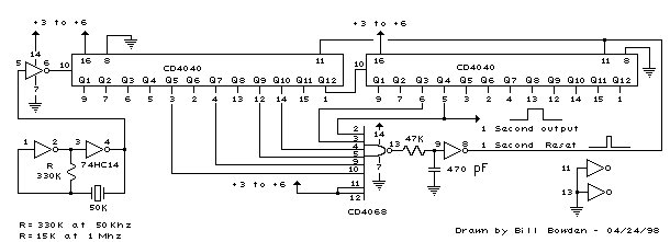 下面的示意圖說明了將晶體振蕩器信號除以晶體頻率,以獲得精確的(0.01%)1秒時基.兩個級聯的12級計數器(CD4040)形成24級二進制計數器,并且將適當的位門控在一起以產生所需的除法.使用一些偶數為2的晶體是理想的,因此計數器的一級自動切換每秒,這消除了對NAND門和復位電路的需要,但是下面的電路說明使用的壓電石英晶體不是2的偶數倍.所以需要額外的組件.