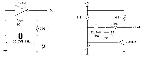 下面是幾個電路,您可以使用這些電路從普通的手表水晶產生32.768KHz的方波.輸出可以饋送到15級二進制計數器以獲得1秒方波.建議在晶體管電路上使用4069逆變器左側的電路,以產生更好的波形.單晶體管電路產生更多的斜坡波形,但輸出擺動整個電源電壓范圍,因此它很容易將輸入驅動到CMOS二進制計數器.