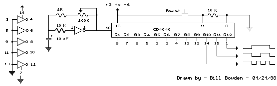 在12級二進制計數器(CD4040)的每個連續級處將頻率除以2,在最終級(Q12)切換到高狀態之前產生大約1小時的時間.通過調整振蕩器頻率或使用不同的RC值可以獲得更長或更短的時間.當前級切換到低狀態(0伏)時,每個連續級改變狀態,因此每級的頻率是之前級的頻率的一半.最后3個階段顯示波形圖.要開始延遲周期,可以通過暫時將復位線(引腳11)連接到正電源來將計數器復位為零.時序精度不如石英晶體振蕩器好,并且可能只有1或2%左右,具體取決于振蕩器電容的穩定性. 電話環發生器使用開關電源
