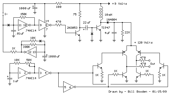 下面所示的電話環發生器從簡單的開關模式電源(SMPS)產生所需的高電壓,該電源采用CMOS施密特觸發器方波振蕩器,10mH電感器,高壓開關晶體管(TIP47或其他高電壓,1安培晶體管)和驅動石英晶振管(2N3053).電感應具有1.5歐姆或更低的低直流電阻.開關電源必須連接負載以防止電壓上升過高,因此在輸出端使用22K電阻,將電壓限制在120DC左右,電話振鈴器斷開,直流電壓約為90V.可以通過改變引腳10和11之間的150K電阻值來調節輸出電壓,這將改變振蕩器頻率(頻率大約為800Hz,如圖所示).通過第二個施密特觸發器振蕩器(引腳12/13)接通和斷開電源,使電話振鈴約2秒鐘,然后電路在振鈴之間空閑約一分鐘.這些時間可通過連接到引腳12的10K和300K電阻進行調整.所示的按鈕用于手動振鈴電話.25Hz振鈴頻率由另一個控制H橋晶體管輸出電路的施密特觸發器振蕩器(引腳1/2)產生.輸出級中的6個晶體管(4個NPN,2個PNP)應為額定電壓為200伏特或更高的高壓類型.振鈴器僅消耗10mA左右,因此輸出晶體管可以具有低額定電流但必須具有高額定電壓.我使用了手頭上的TIP47s和未知數字的小信號PNP,但其他類型如NTE287(NPN)和NTE288(PNP)應該有效.兩者都有300伏的CE評級,郵購機構的成本約為0.95美元.