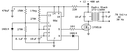 該環形發生器每10秒鐘響一次電話.通過改變1Meg電阻的值,可以延長或縮短環之間的間隔.70伏/30赫茲環電壓由小型12.6VAC電源變壓器(RadioShack273-1365)的120伏側產生.連接在變壓器繞組兩端的兩個電容器都是非極化/100伏特.在振鈴間隔期間,電路從12伏直流電源吸收大約300mA電流.