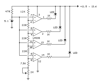 在下面的電路中,四電壓比較器(LM339)用作簡單的條形圖表,用于指示12伏鉛酸電池的充電狀況.5伏參考電壓連接到四個比較器的每個(+)輸入,(-)輸入連接到沿分壓器的連續點.當負(-)輸入電壓超過參考電壓時,LED將亮起.校準可以通過調節2K電位器來完成,這樣當電池電壓為12.7伏時,所有四個LED都會亮起,表示電池沒有負載就完全充電.在11.7伏特時,LED應該熄滅,表示電池耗盡.每個LED表示充電狀態變化約為25%或300毫伏,因此3個LED表示75%,2個LED表示50%等.