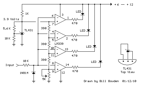 這是與上述類似的電路,并提供了一個4LED條形圖,顯示了常見的3.6伏鋰離子可轉換手機電池的電壓.參考電壓由TL431可編程電壓源提供,該電壓源設置為3.9伏,TL431連接到1K電阻.引腳14處LED的下部參考電壓由5K可調電阻設置.