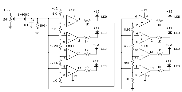 下面的電路使用兩個四路電壓比較器(LM339)來照亮一系列指示音量的8個LED.8個比較器中的每一個都被分壓器設定的增加的電壓偏置,以便當輸入在8歐姆系統中輸入大約400毫伏或大約22毫瓦峰值時,右下LED首先亮起.設置分壓器電壓,使每個LED的功率水平大約是前一個LED的兩倍,因此當所有LED點亮時,水垢從22毫瓦延伸到大約2.5瓦.輸入控制可以降低靈敏度以讀取更高的水平.我沒有制作或測試過這個電路,所以如果你在使用它時遇到問題,請告訴我.功率水平應如下: