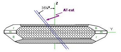 在各種不同種類的切割角度方式中, AT角度切割的石英芯片適用在數MHz到數佰MHz的率范圍,是石英芯片應用范圍最廣范及使用數量最多的一種切割應用方式. 在(如圖)中, 從石英晶棒X-軸向的上視圖, 可以看到對Z-軸向旋轉約35度的AT 方向. 這在大量生產的技術上也是很好達成的一種作業方式.