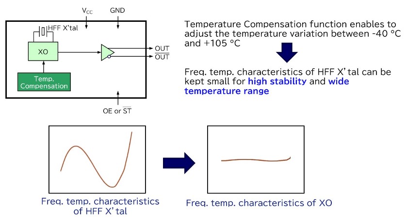 用于SPXO的HFF晶體芯片和內(nèi)部低噪聲IC實(shí)現(xiàn)了低相位抖動(dòng)/相位噪聲特性。
