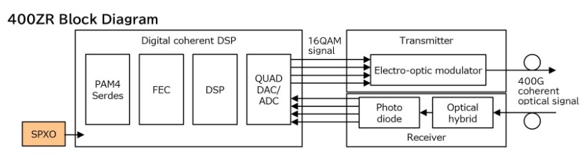 DSP內(nèi)部的DAC/ADC需要極低抖動(dòng)的采樣時(shí)鐘,并且在GHz頻段內(nèi)處理400/800G信號(hào)。為了產(chǎn)生這個(gè)時(shí)鐘,需要一個(gè)高頻、低抖動(dòng)和高穩(wěn)定性的SPXO石英貼片晶振。此外,還需要更低的電流消耗和更小的尺寸。愛(ài)普生SPXOs提供全部。