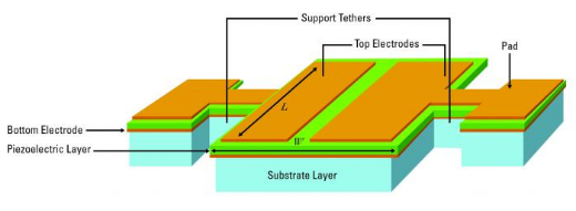 將電刺激施加到頂部電極之一激勵壓電層,其中橫向壓電系數(shù)e31在整個裝置中產(chǎn)生體聲波.然后諧振器橫向振動,并且機械運動通過壓電層轉(zhuǎn)換以由另一個頂部電極感測.器件的橫向長度L,組合諧振器本體EEFF的有效彈性常數(shù)和有效質(zhì)量密度決定了基模的諧振頻率.