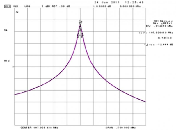 當體聲波在諧振器主體中沿不同方向分散時,通過設(shè)計諧振器的厚度和寬度以使來自其他方向的損失最小化,可以使所需長度方向上的能量最大化.例如,典型的107-MHz諧振器圖顯示測得的Q值為7453,IL為-12.4dB(圖2).