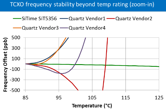 我們在測試OCXO晶振設備時會看到類似的行為,如下圖所示.在這里,我們比較了四個工業級OCXO器件的性能,從+85°C到+125°C.石英器件的穩定性在溫度超過額定溫度范圍后開始降低,而基于MEMS的SiT5711EmeraldPlatform™OCXO可保持穩定性.