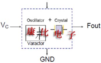 通過向其控制電壓引腳(VC)施加模擬電壓,其輸出頻率(Fout)可以在連續的頻率范圍內在任一方向上偏離標稱值.控制電壓與變容二極管相連.這種二極管的可變電容是所施加電壓的函數.在圖1和圖2中,請注意,隨著可變電容的變化,它會導致電容負載的變化.CL的變化導致Fout的變化.如圖2所示,理想情況下,VC和Fout之間存在線性關系.
