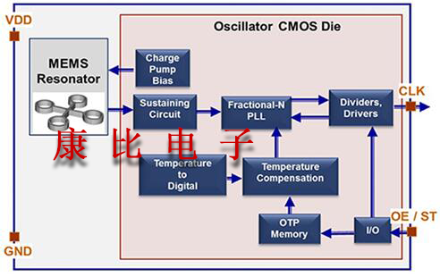 振蕩器/驅(qū)動(dòng)器為MEMS結(jié)構(gòu)提供激勵(lì),并將其輸出饋送至小數(shù)N分頻鎖相環(huán)(PLL),并由該鎖相環(huán)將MEMS器件的輸出頻率乘以可編程因子"N".一次性可編程(OTP)存儲(chǔ)器用于存儲(chǔ)模塊配置參數(shù).溫度補(bǔ)償可通過調(diào)節(jié)PLL內(nèi)的輸出頻率來實(shí)現(xiàn).此外,也可對(duì)PLL進(jìn)行編程,從而為振蕩器提供數(shù)字控制的頻率輸出.可編程晶振的最大優(yōu)點(diǎn)是不受機(jī)械沖擊和振動(dòng)的影響,此優(yōu)點(diǎn)是手機(jī),相機(jī)和手表等移動(dòng)應(yīng)用中的一個(gè)重要因素.