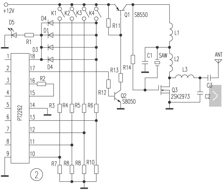 這是一個帶地址編碼的四鍵微型超遠程遙控發(fā)射機,電路原理見下: R11~R13、Q1、Q2組成電子開關式調制電路,當編碼器輸出為高電平時Q1導通,振蕩發(fā)射級工作;當編碼器輸出為低電平時Q1截止,振蕩發(fā)射級停止工作,從而完成ASK調制。R14、Q3、C1、L1、L2及聲表諧振器SAW組成315MHz的功率振蕩級,Q3為高頻功率場效應管,在450MHz下可輸出1.5W的功率,其中L1、L2及C1組成SAW所需要的移相選頻及匹配網絡,使Q3與SAW在很高的效率下工作。L3、C2及C3組成天線匹配網絡,使天線阻抗與振蕩級匹配,確保其穩(wěn)定工作。