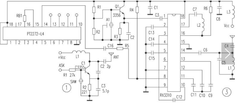 接收機是用聲表面濾波器穩(wěn)頻的超外差式成品板,電路原理見下: 接收機以集成電路RX3310為核心元件,組成ASK制解調的超外MHz式接收機,其靈敏度為-105dBm。RX3310的①、②腳為本機振蕩回路元件連接端,外接一個LC選頻網絡即可產生本振信號。為了提高本機穩(wěn)定性,本振信號用外接的聲表穩(wěn)頻振蕩電路產生,通過①腳輸入。解調出的數據信號從⑧腳輸出送入解碼器解碼。